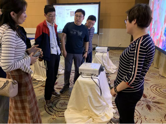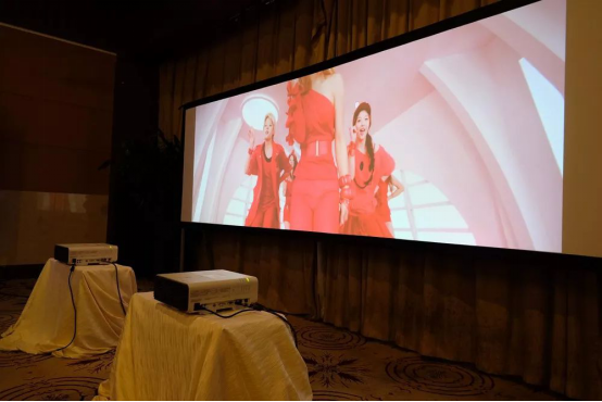 會場前方,使用了兩個150寸的投影幕作為主播放屏幕,分別采用了Canon WUX7000Z 3LCOS激光投影機和WUX6700 3LCOS投影機。同時,后場還展示兩臺Canon WUX500ST 3LCOS短焦投影機的拼接融合,LX-MU500 DLP投影機、LX-MU500Z DLP激光投影機、LX-MU800Z DLP激光投影機等多臺設(shè)備。